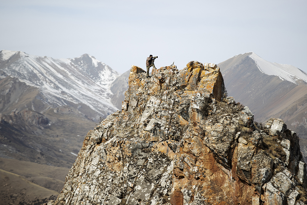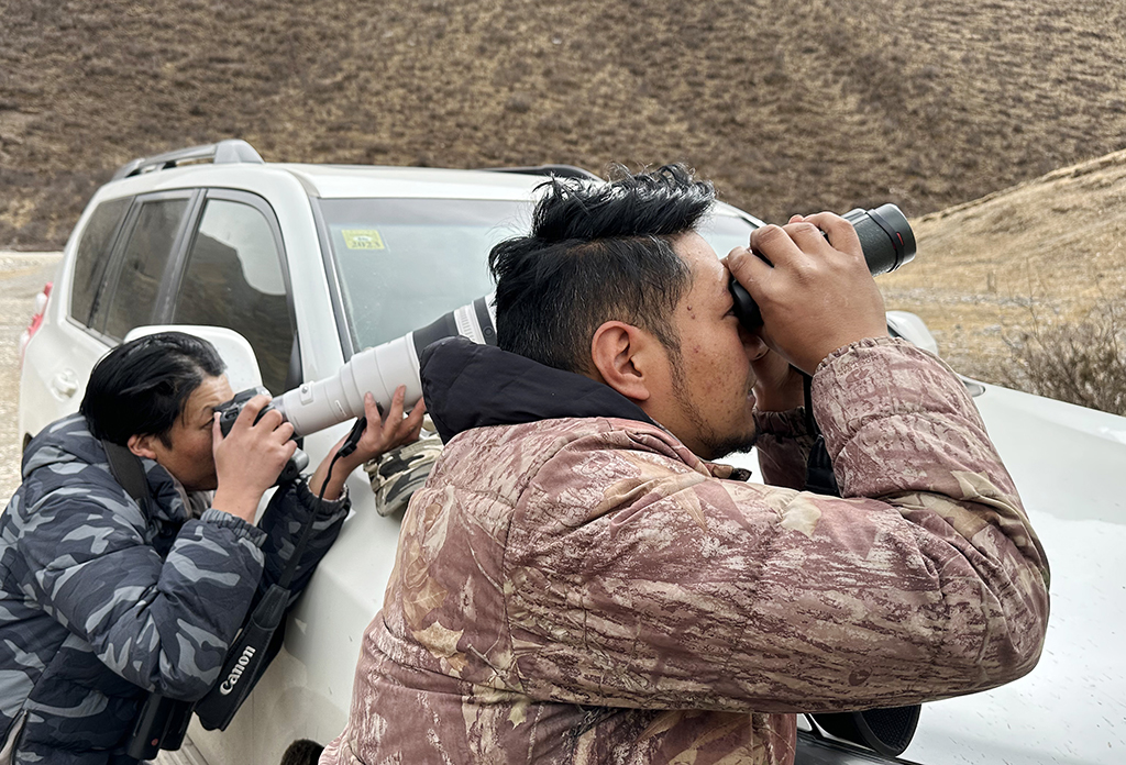 2月21日,更求曲朋(右)和才仁尼瑪在昂賽大峽谷里觀察遠處的雪豹。新華社記者 費茂華 攝