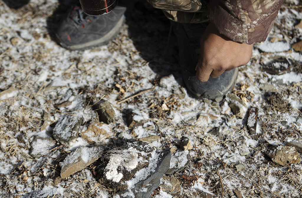 2月21日,更求曲朋在昂賽大峽谷里巡護時查看巖羊留下的毛發。新華社記者 費茂華 攝