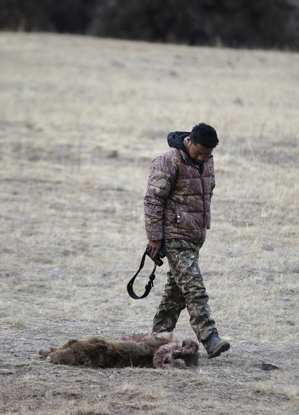 2月21日,更求曲朋在昂賽大峽谷里查看一只被獵殺不久的白唇鹿。新華社記者 費茂華 攝