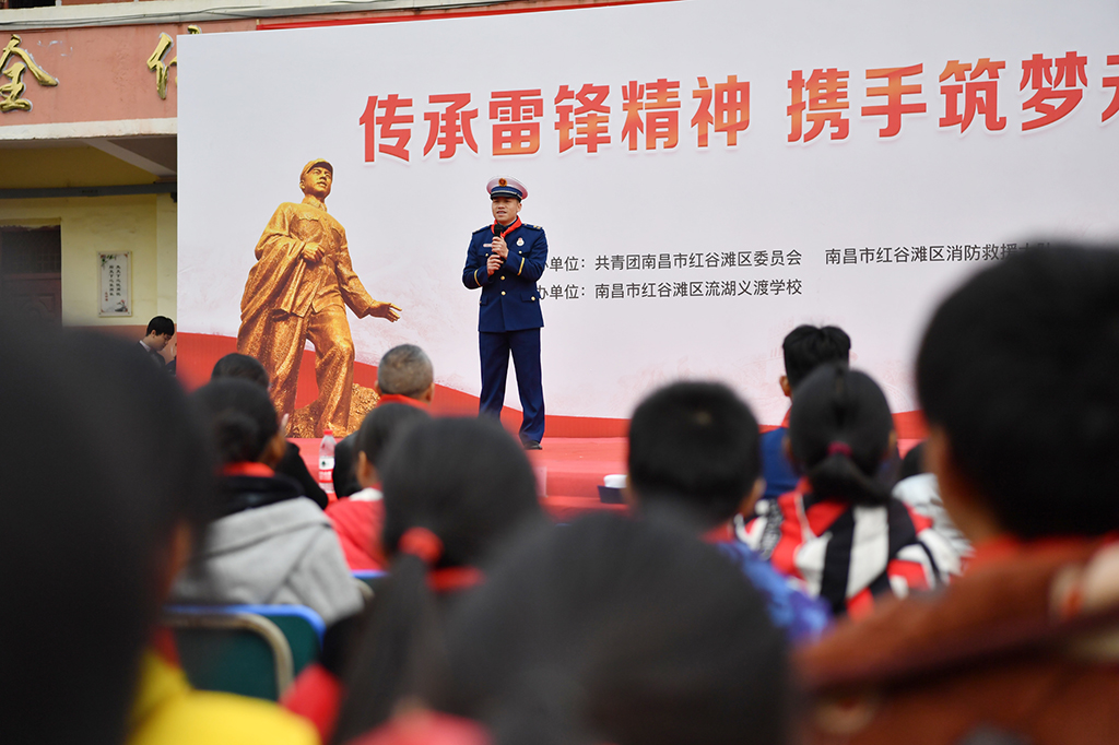 3月3日,在江西南昌紅谷灘區流湖義渡學校,紅谷灘區消防救援大隊的“雷鋒哥”蒙邦雷正在為一群鄉村小學的孩子們講述雷鋒的故事。蒙邦雷加入消防救援隊伍16年,獲評全國道德模范“誠實守信類”中國好人,同時也被共青團江西省委授予“雷鋒哥”榮譽稱號;顒蝇F場,蒙邦雷聲情并茂地跟全體師生分享了雷鋒同志的生平事跡、助人為樂的暖心故事,同時也表達了自身對雷鋒精神的傳承與理解,并激勵學生們做好新時代雷鋒精神的傳承者,將雷鋒精神廣為弘揚、賡續傳承。人民網 時雨攝
