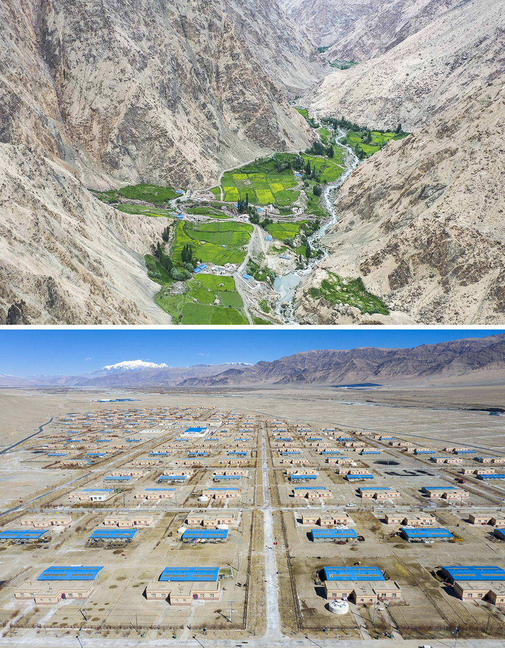 拼版照片:上圖為新娘古麗汗·贊加比力家易地扶貧搬遷前所住的馬爾洋鄉的山村一角(無人機照片,2019年6月28日攝);下圖為古麗汗家搬遷后所在的富民村、愛民村(無人機照片,2023年3月17日攝)。 新華社記者 胡虎虎 攝