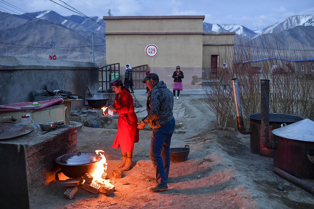新郎買熱買提汗·青鐵木爾的姐姐(左)為參加婚禮的親友在門前小院做晚餐(3月18日攝)。新華社記者 胡虎虎 攝