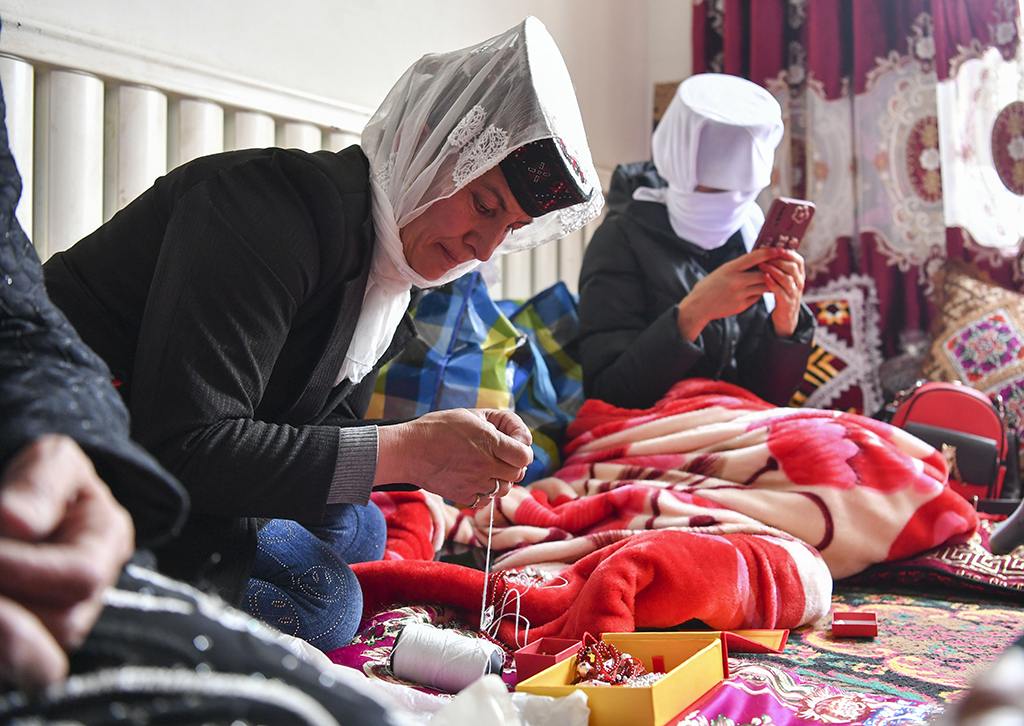 新娘古麗汗·贊加比力的長輩在為她準備婚禮儀式上需要穿戴的飾品(3月18日攝)。新華社記者 胡虎虎 攝