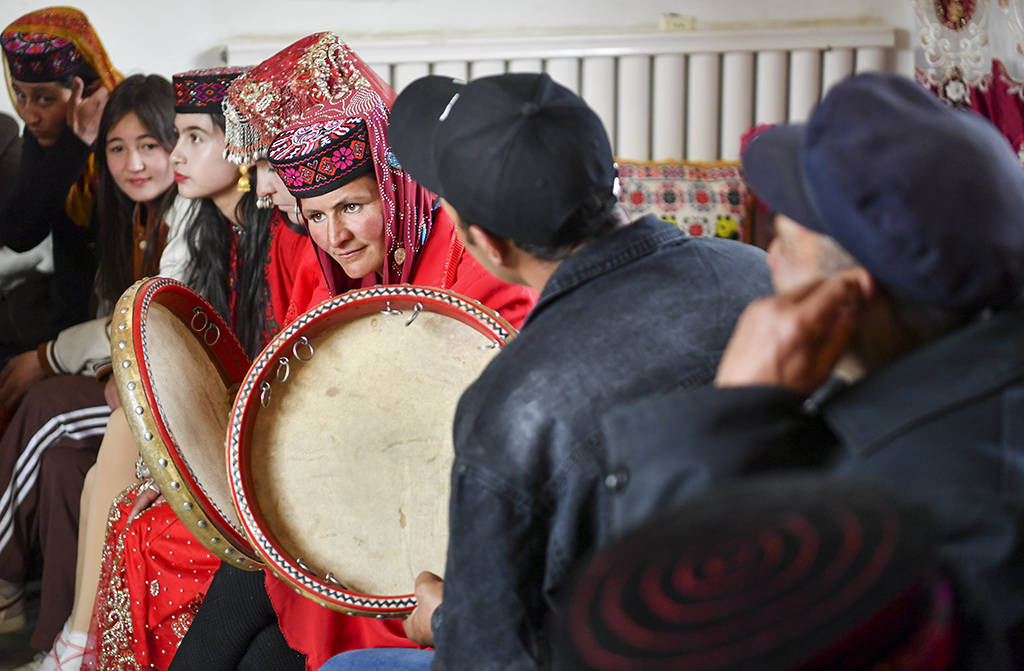 新娘古麗汗·贊加比力的親友在家中打手鼓、唱歌慶祝(3月18日攝)。新華社記者 李響 攝