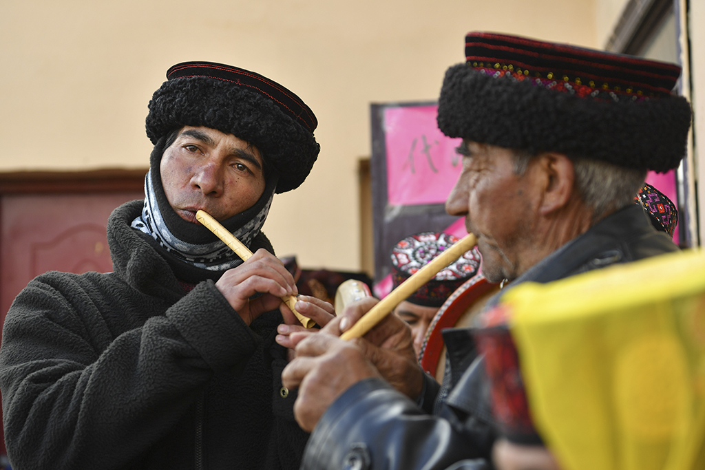 新娘古麗汗·贊加比力的親友在家門口為前來跳舞慶賀的人群演奏鷹笛(3月18日攝)。新華社記者 胡虎虎 攝