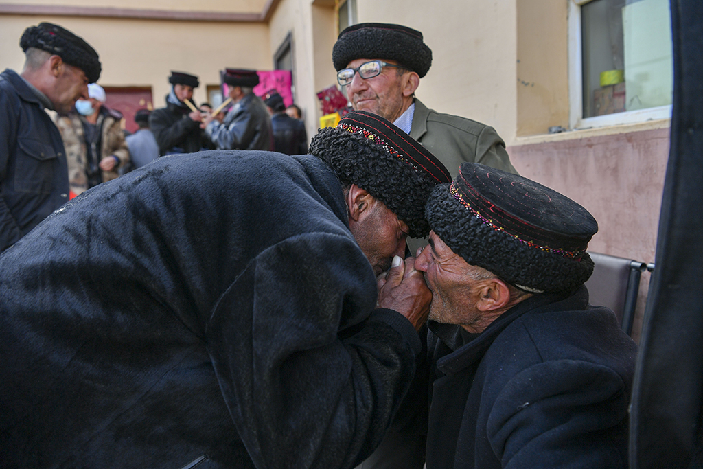 前來參加婚禮的親友在新娘古麗汗·贊加比力的家門口行“貼面吻手”禮(3月18日攝)。新華社記者 胡虎虎 攝