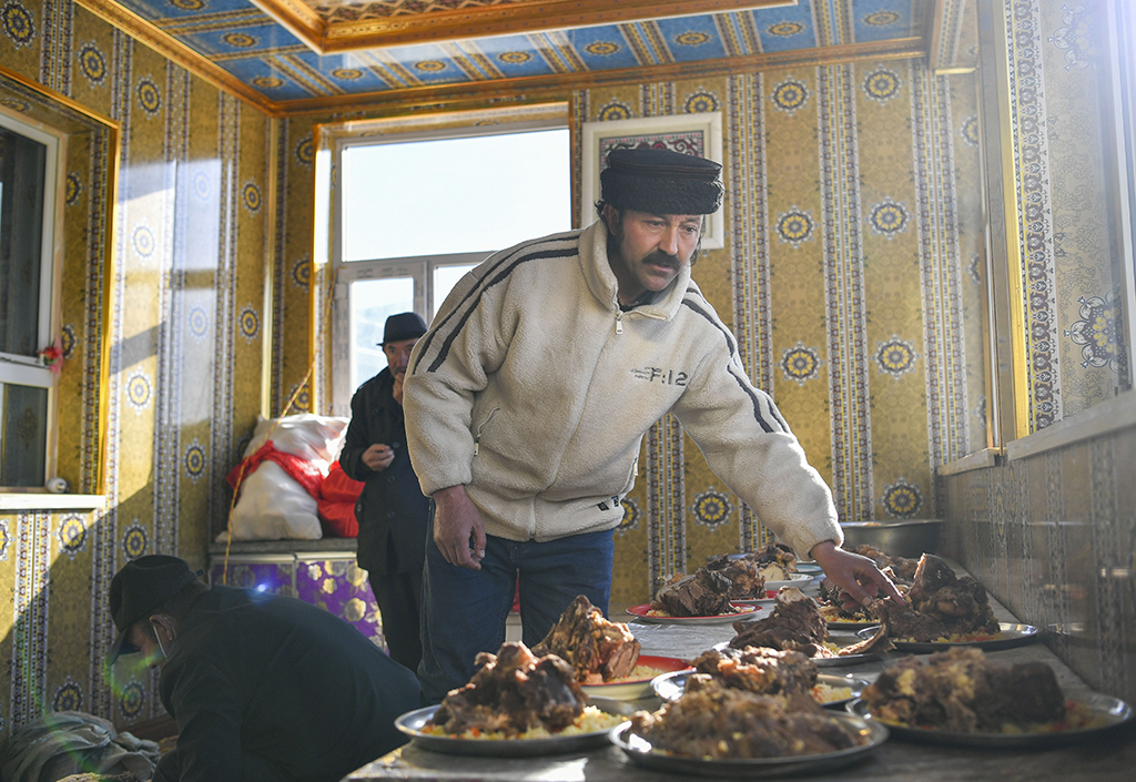 新郎買熱買提汗·青鐵木爾的一位長輩在家中為親友準備牦牛肉手抓飯(3月19日攝)。新華社記者 胡虎虎 攝