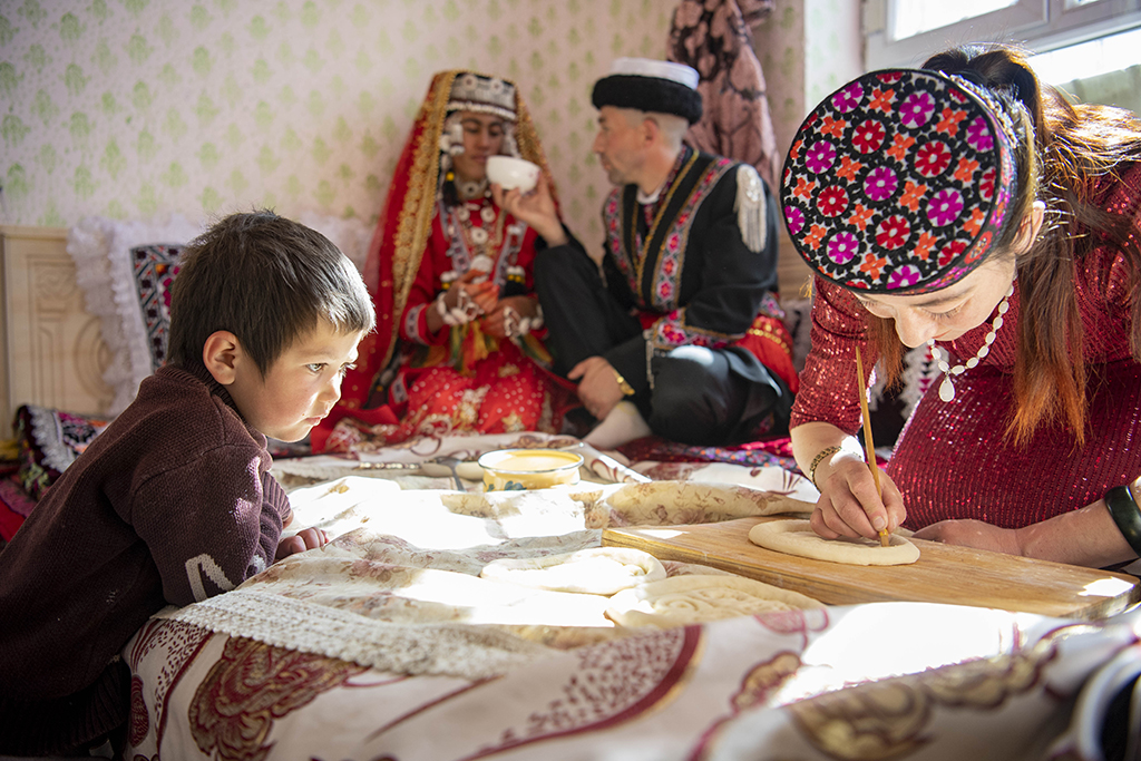 在位于縣城的新家中,新郎買熱買提汗·青鐵木爾的姐姐為一對新人制作象征祝福的馕餅,新郎的小侄女在一旁好奇觀看(3月20日攝)。新華社記者 胡虎虎 攝