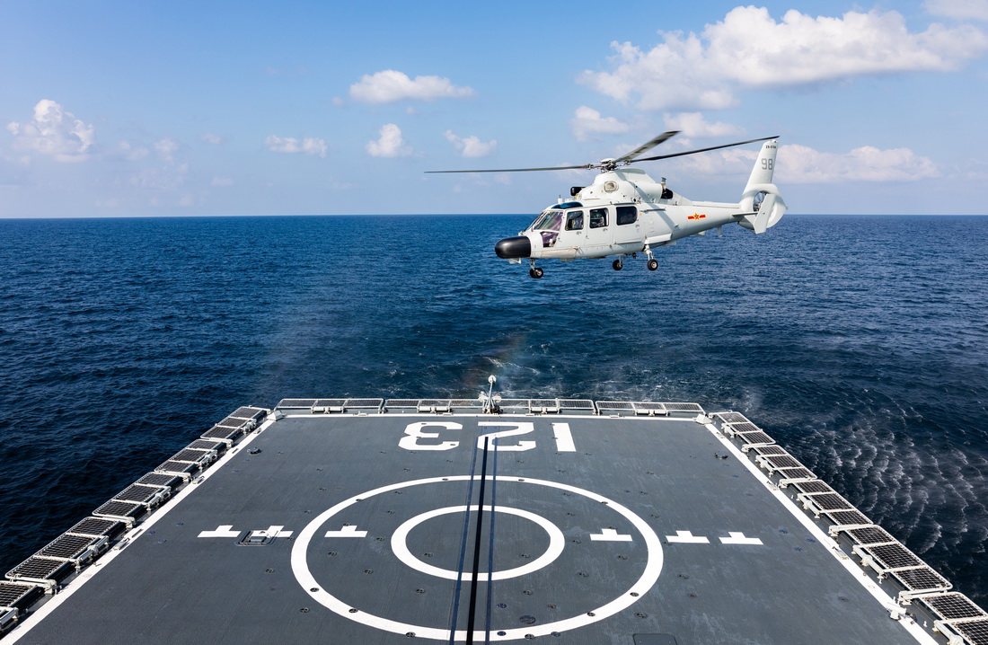 中國海軍第42批護航編隊組織艦載直升機在導彈驅逐艦淮南艦上起飛前出(2023年2月3日攝)。新華社發(徐濤濤 攝)