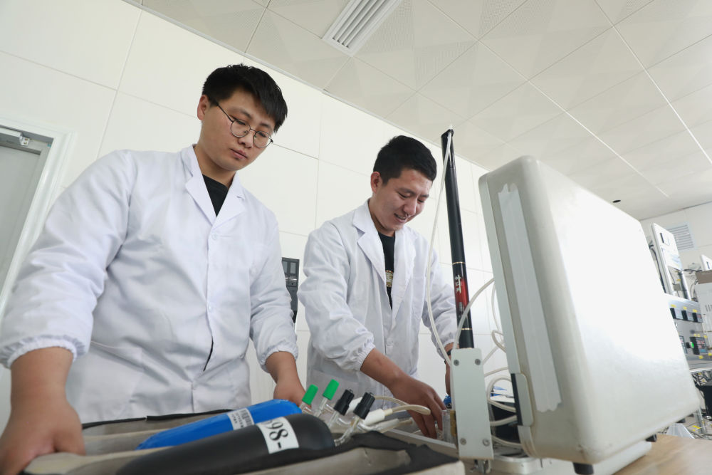 4月6日,瓦里關本底站觀測員時聞(左)和楊昊(右)在準備開展氣瓶采樣。新華社記者 李占軼 攝