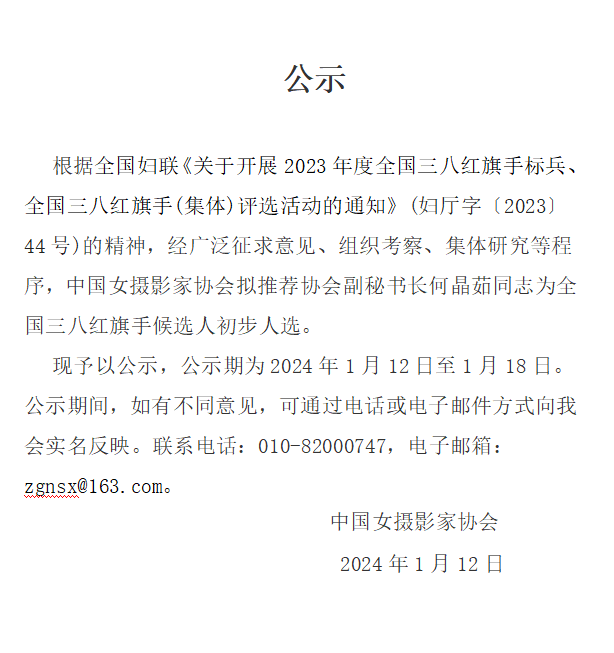 根據全國婦聯《關于開展2023年度全國三八紅旗手標兵、全國三八紅旗手(集體)評選活動的通知》(婦廳字〔2023〕44號)的精神,經廣泛征求意見、組織考察、集體研究等程序,中國女攝影家協會擬推薦協會副秘書長何晶茹同志為全國三八紅旗手候選人初步人選。