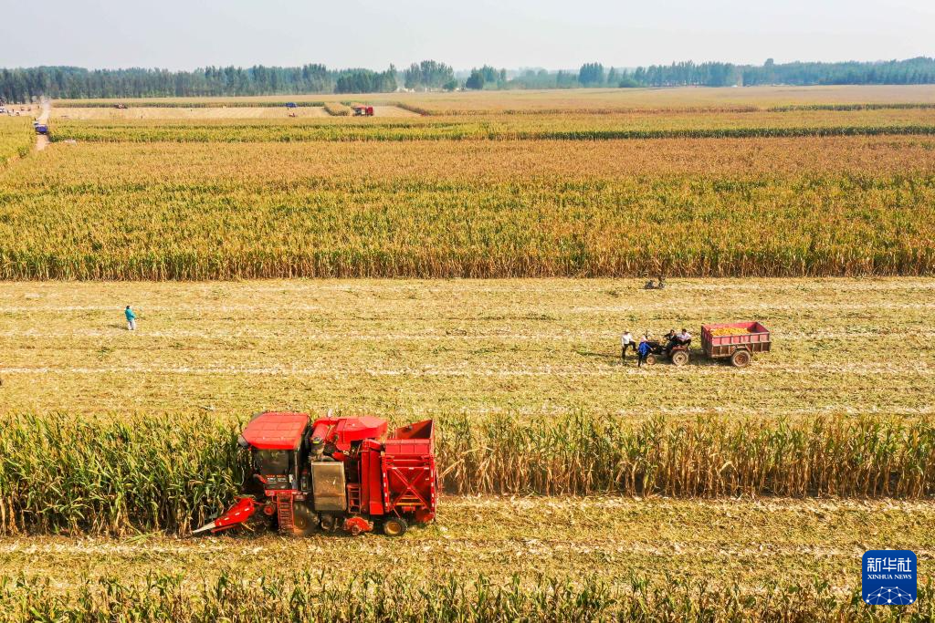9月25日,在河南省焦作市武陟縣嘉應觀鎮西營村的高標準農田,農民在收獲玉米(無人機照片)。