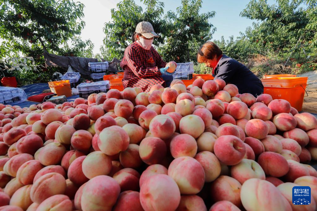 9月25日,河北省遵化市興旺寨鎮西達峪村農民在山地果園精選收獲的秋桃,準備外運。