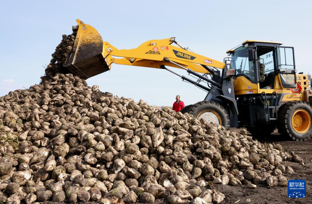 9月24日,在北大荒集團建設農場有限公司第三管理區甜菜地塊,工人整理剛收獲的甜菜。
