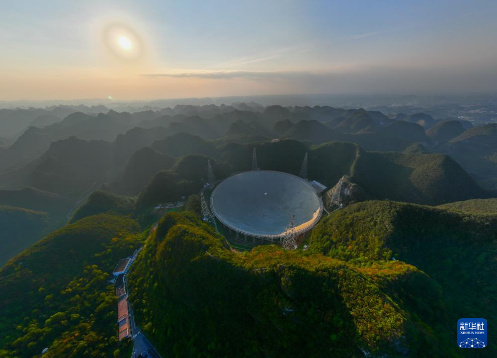 中國天眼在落日余暉中(無人機照片,維護保養期間拍攝,9月25日攝)。