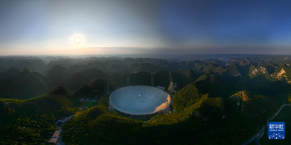 中國天眼在落日余暉中(無人機照片,維護保養期間拍攝,9月25日攝)。