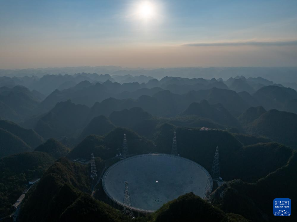中國天眼在落日余暉中(無人機照片,維護保養期間拍攝,9月25日攝)。