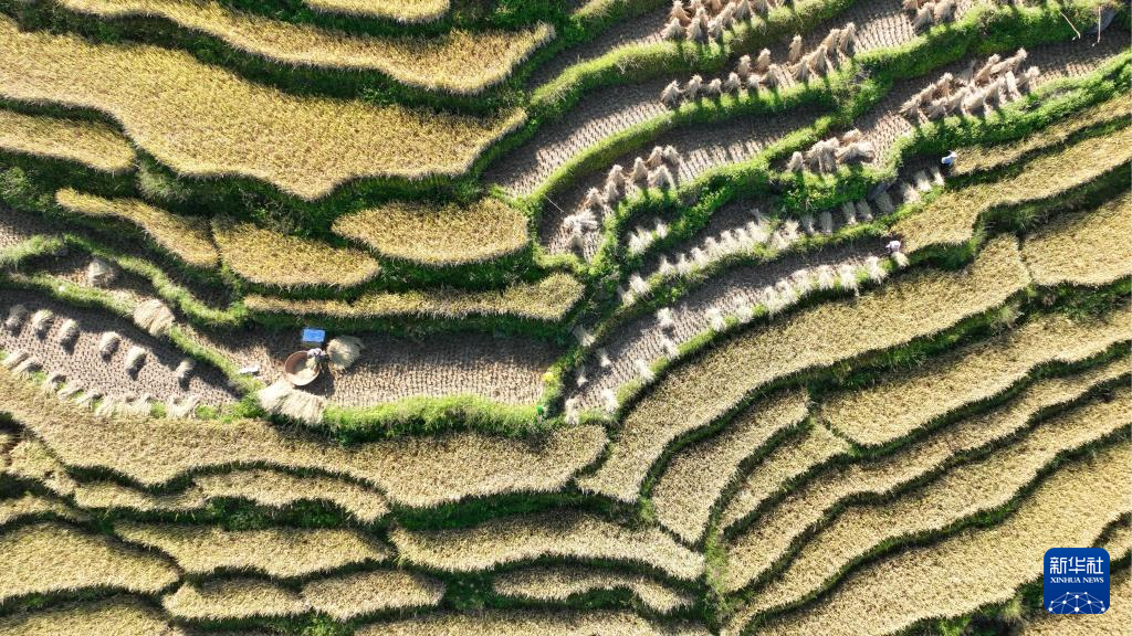 10月27日,在云南省騰沖市荷花鎮汪李村,農民在收獲晚稻(無人機照片)。