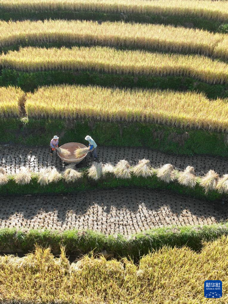 10月27日,在云南省騰沖市荷花鎮汪李村,農民在收獲晚稻(無人機照片)。