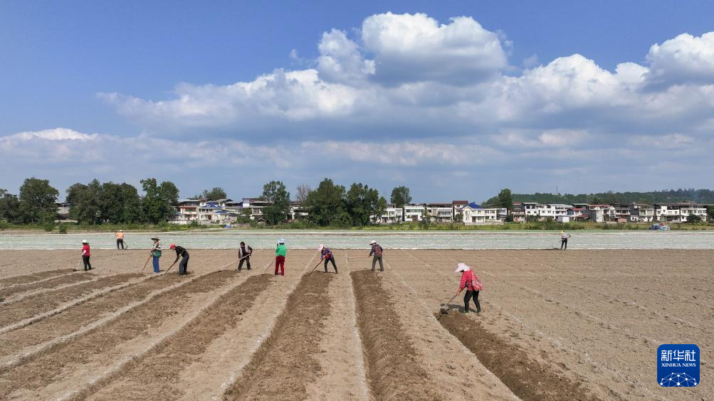 10月28日,在四川省遂寧市蓬溪縣紅江鎮白坪村,村民在為種植芍藥做準備(無人機照片)。