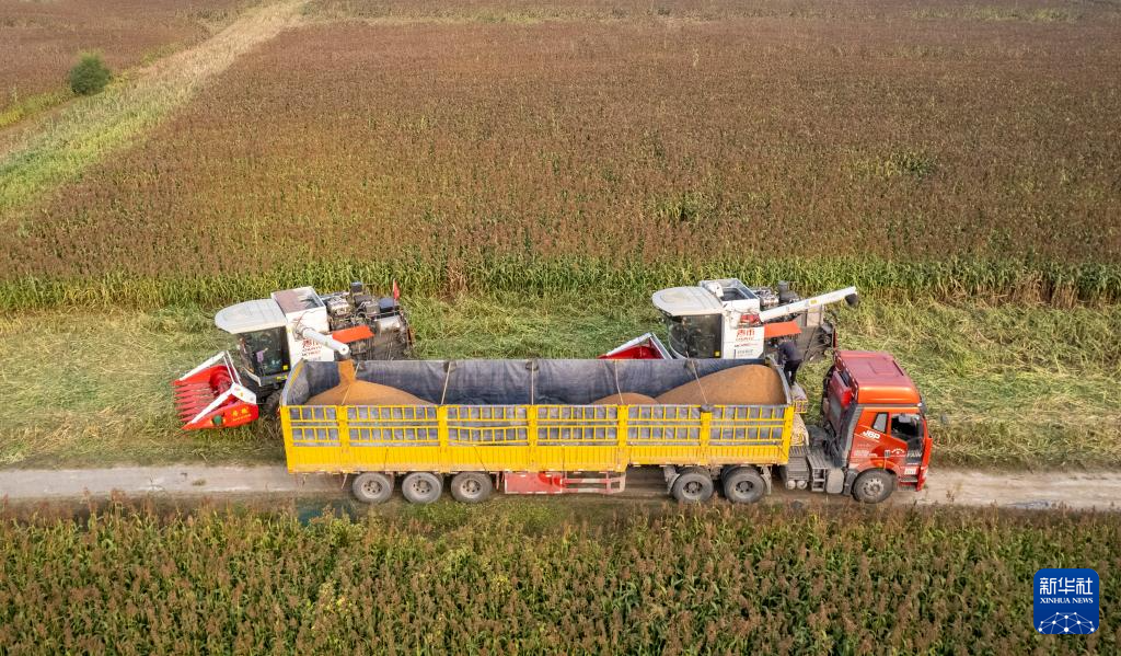 10月28日,在河南省商丘市夏邑縣會亭鎮花園村,收割機將收獲的高粱裝車外運(無人機照片)。