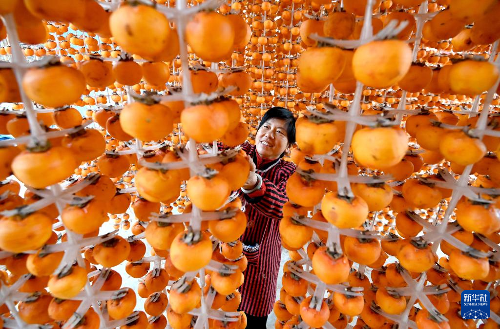 10月28日,河北省邯鄲市磁縣北賈璧鄉北賈璧村的農民在吊曬柿子。