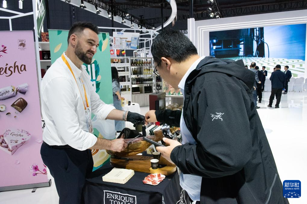 11月5日,參展商(左)在第七屆進博會食品及農產品展區介紹西班牙火腿。