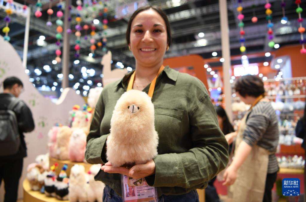 11月5日,參展商在第七屆進博會消費品展區秘魯溫暖駝展臺展示羊駝玩偶。