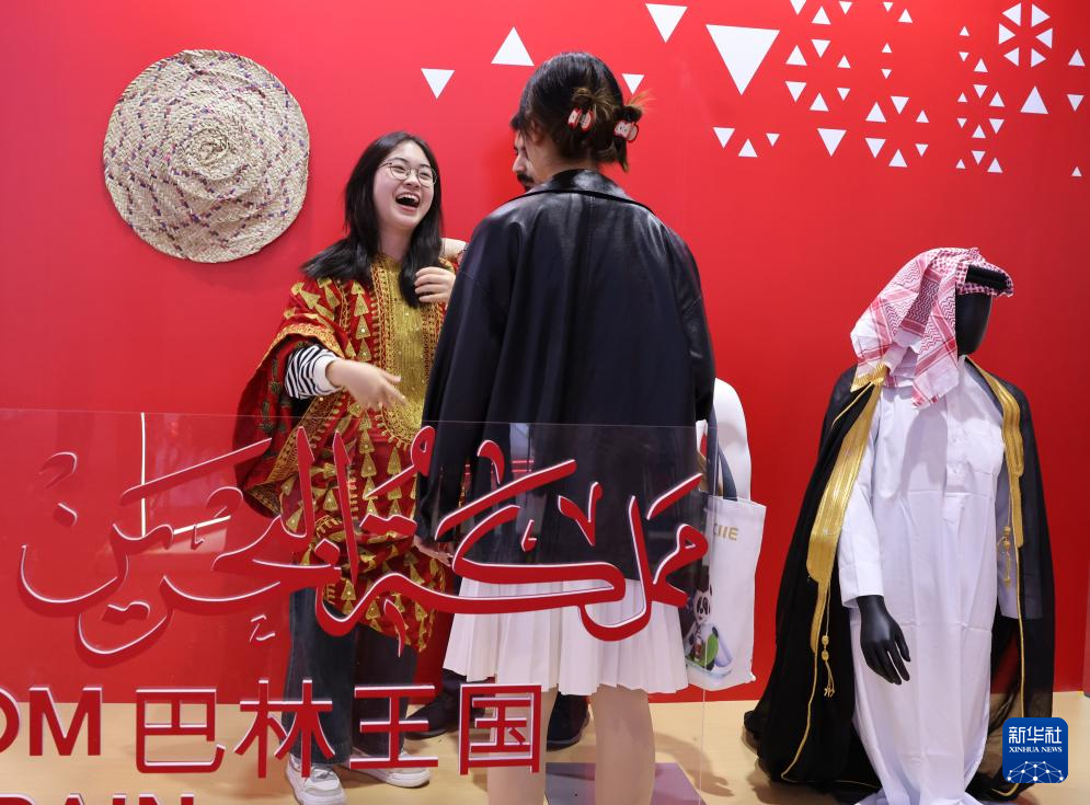 11月5日,參會者在第七屆進博會國家展巴林館試穿巴林服裝。