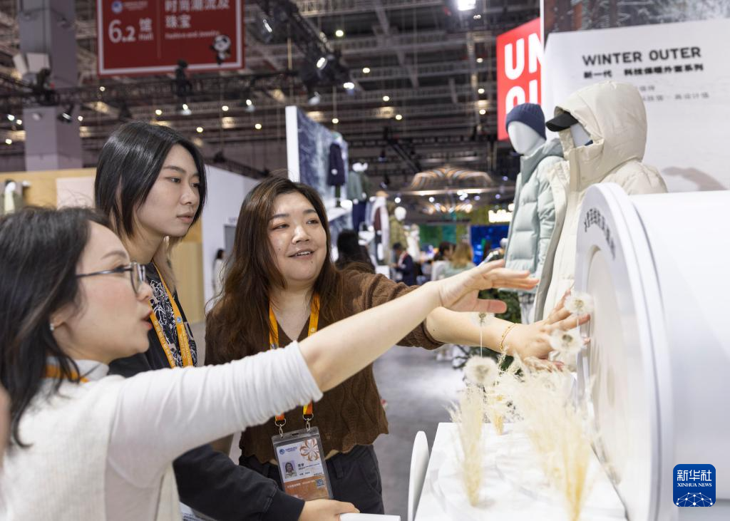 11月5日,人們在第七屆進博會消費品展區優衣庫展臺體驗冰雪羽絨防風面料。