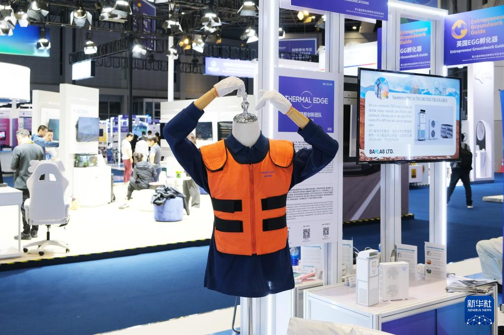 這是11月5日在第七屆進博會創新孵化專區拍攝的英國拜朗創新團隊研發的智慧溫控工作服。