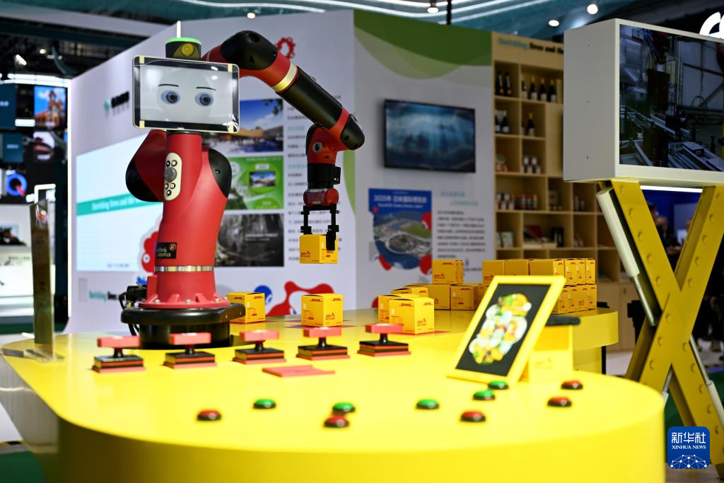 11月5日在第七屆進博會服務貿易展區DHL(敦豪)展臺拍攝的分揀機械臂。