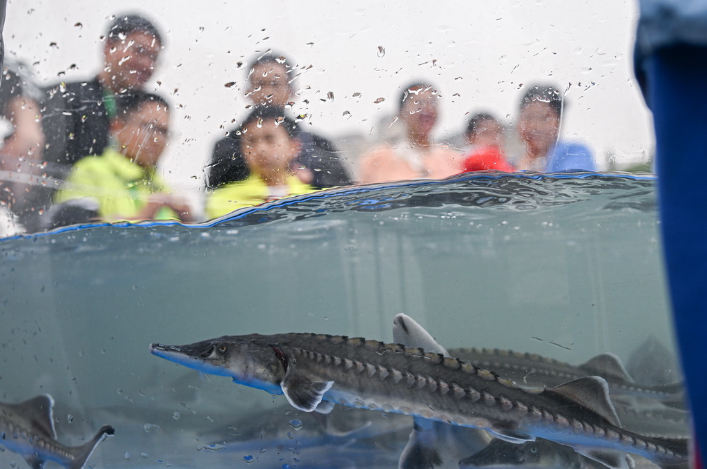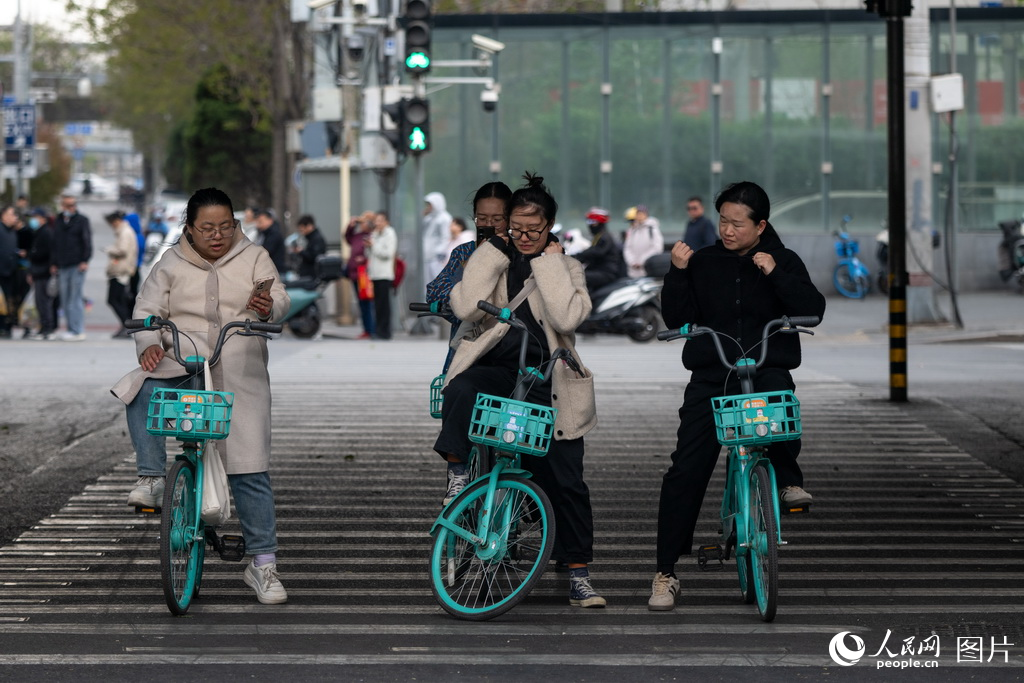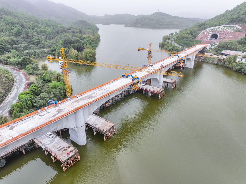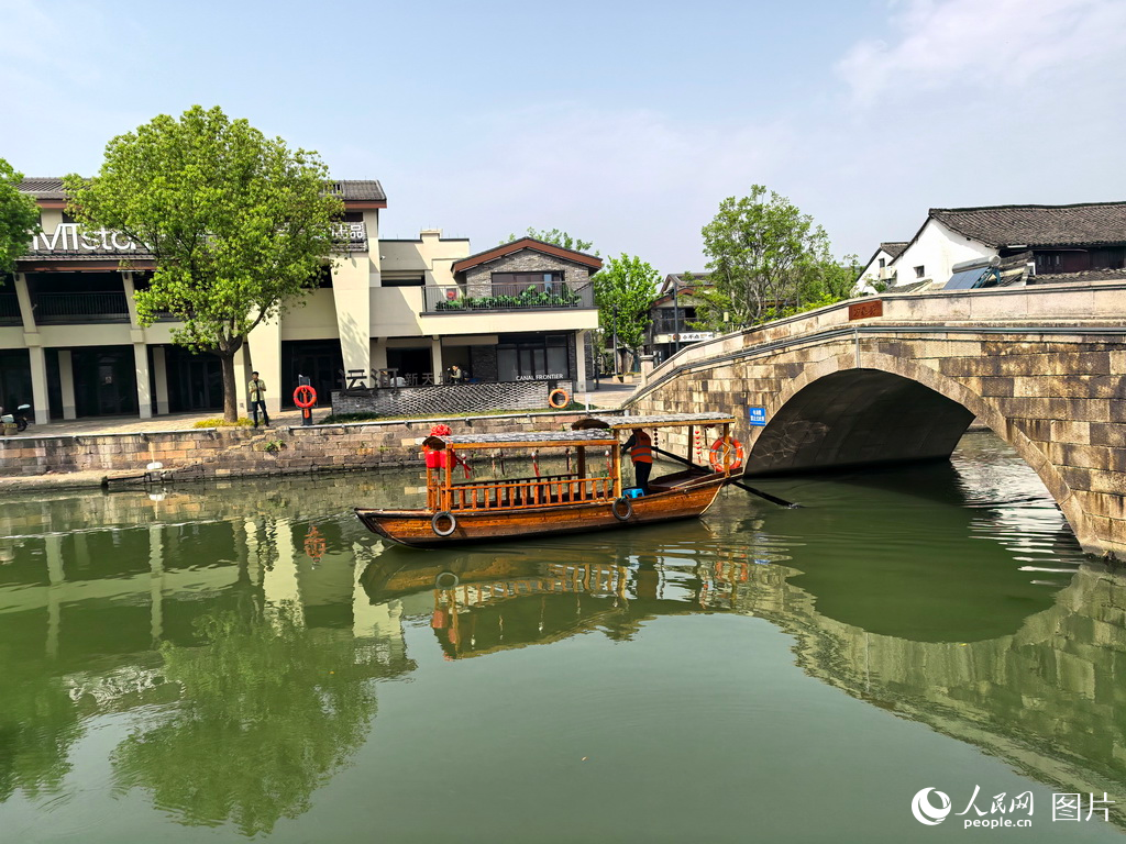 2025年4月13日,安徽省合肥市包河區南淝河上,一列動車飛速駛過,周邊的生態濕地與鄉村相映成畫。馬二虎攝(人民圖片網)