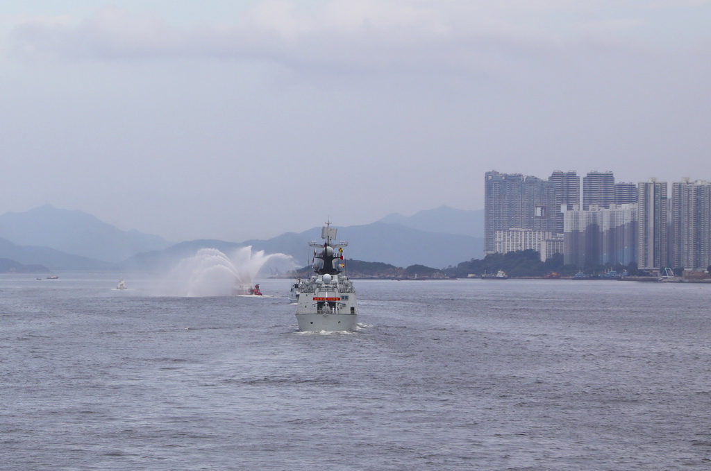 7月3日,中國海軍山東艦航母編隊抵達香港。這是特區政府消防船為艦艇編隊舉行水門禮。新華社記者 黎云 攝
